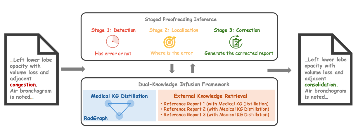 The increasing complexity and workload of clinical radiology leads to inevitable oversights and mistakes in their use as diagnostic tools, causing delayed treatments and sometimes life-threatening harms to patients. While large language models (LLMs) have shown remarkable progress in many tasks, their utilities in detecting and correcting errors in radiology reporting are limited. We present a novel dual-knowledge infusion framework that enhances LLMs’ capability for radiology report proofreading through systematic integration of medical expertise. Specifically, our knowledge infusion combines medical knowledge graph distillation (MKGD) with external knowledge retrieval (EXKR), enabling an effective automated approach in tackling mistakes in radiology reporting. By decomposing the complex proofreading task into three specialized stages of detection, localization, and correction, our method mirrors the systematic review process employed by expert radiologists, ensuring both precision and clinical interpretability. The dual-knowledge framework captures intricate medical relationships through structured graph representations while leveraging curated clinical expertise from reference reports. To perform a robust, clinically relevant evaluation, we constructed a comprehensive benchmark using real-world radiology reports with error patterns derived from real-world scenarios, including speech recognition confusions, terminology ambiguities, and template-related inconsistencies, all validated by practicing radiologists. Extensive evaluations across multiple LLM architectures demonstrate substantial improvements of our approach - up to 31.56% increase in error detection accuracy and 37.4% reduction in processing time. Human evaluation by radiologists confirms superior clinical relevance and factual consistency compared to existing approaches. Our framework addresses critical needs in clinical practice by enhancing report quality while reducing radiologist burden, particularly benefiting resource-constrained healthcare environments.